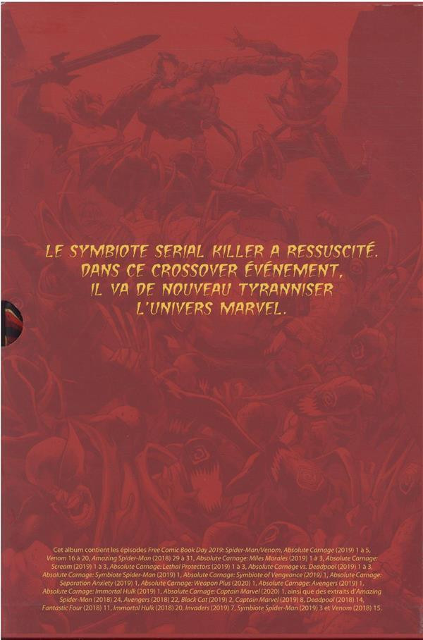 Carnage est de retour, plus puissant que jamais ! Cletus Kasady, investi de nouveaux pouvoirs, s’est fixé une mission : massacrer tous ceux qui n’ont jamais porté un symbiote. Et autant dire qu’à New York, ils sont nombreux, même parmi les super-héros Marvel. Deadpool, Hulk, Captain Marvel, les Fantastiques, ils sont tous des cibles ! C’est le début d’un affrontement sanglant et terrifiant que Spider-Man et Venom ne pourront évidemment pas mener seuls. Avengers, rassemblement ! Retrouvez la saga en version intégrale, avec tous les épisodes liés. Tandis que l’album 100% MARVEL se concentre sur la mini-série Absolute Carnage, le volume ABSOLUTE voit les choses en grand en présentant tous les épisodes concernés ! Les séries Venom, Amazing Spider-Man sont largement représentées, ainsi que les diverses mini-séries et one-shots liés au crossover. On y trouve aussi les récits annonçant l’événement dans les séries régulières ainsi que des planches inédites.