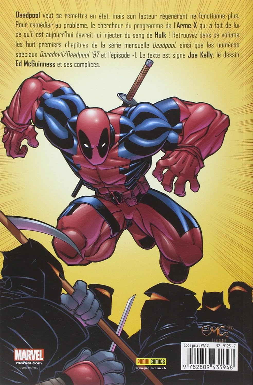 Deadpool veut se remettre en état, mais son facteur régénérant ne fonctionne plus. Pour remédier au problème, le chercheur du programme de l’Arme X qui a fait de lui ce qu’il est aujourd’hui devrait lui injecter du sang de Hulk ! Retrouvez dans ce volume les huit premiers chapitres de la série mensuelle Deadpool, ainsi que les numéros spéciaux Daredevil/Deadpool ’97 et l’épisode -1. Le texte est signé Joe Kelly, le dessin Ed McGuinness et ses complices.