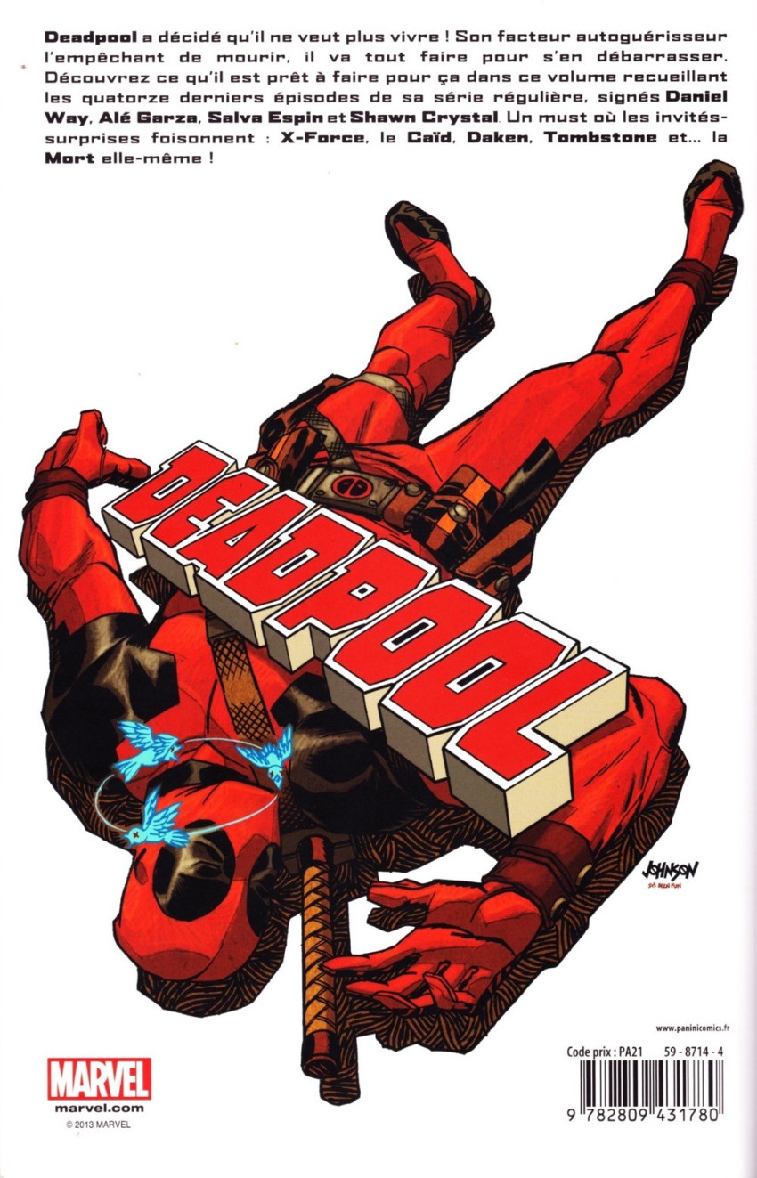 Deadpool a décidé qu’il ne veut plus vivre ! Son facteur autoguérisseur l’empêchant de mourir, il va tout faire pour s’en débarrasser. Découvrez ce qu’il est prêt à faire pour ça dans ce volume recueillant les quatorze derniers épisodes de sa série régulière, signés Daniel Way, Alé Garza, Salva Espin et Shawn Crystal. Un must où les invités-surprises foisonnent : X-Force, le Caïd, Daken, Tombstone et…. la Mort elle-même !