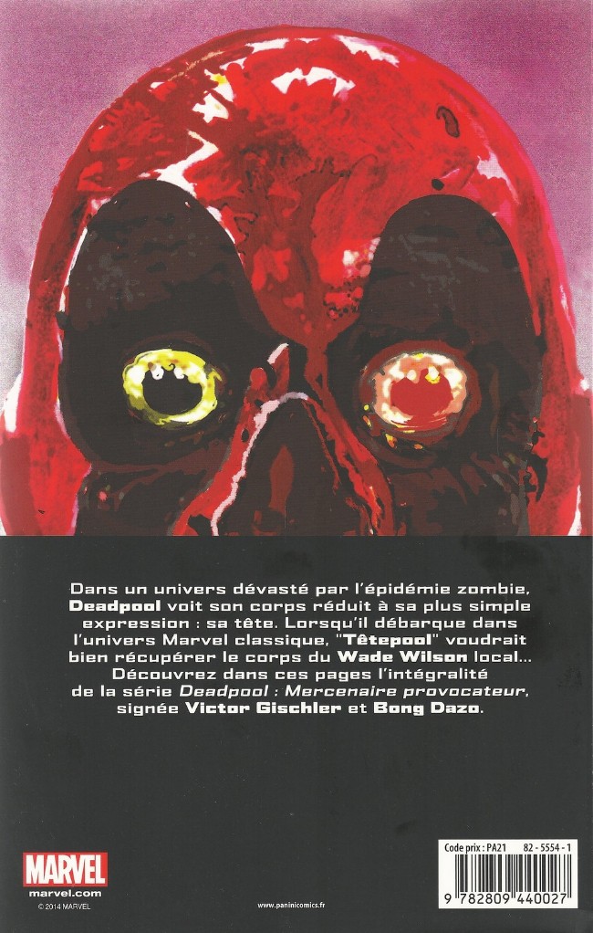 Dans un univers dévasté par l’épidémie zombie, Deadpool voit son corps réduit à sa plus simple expression : sa tête. Lorsqu’il débarque dans l’univers Marvel classique, “Têtepool” voudrait bien récupérer le corps du Wade Wilson local… Découvrez dans ces pages l’intégralité de la série Deadpool : Mercenaire provocateur, signée Victor Gischler et Bang Dazo.