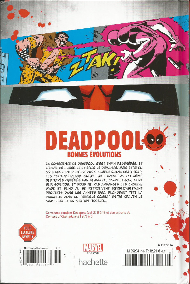 La conscience de Deadpool s’est enfin régénérée, et l’envie de jouer aux héros le démange. Mais être du côté des gentils n’est pas si simple quand Deathtrap, les tout-nouveaux Great Lake Avengers ou même des tarés obsédés par Deadpool, comme T-Ray, sont sur son dos. Et pour ne pas arranger les choses, Wade et Blind Al se retrouvent inexplicablement projetés dans les années 1960, plongeant la tête la première dans un terrible combat entre Kraven le chasseur et un certain tisseur…