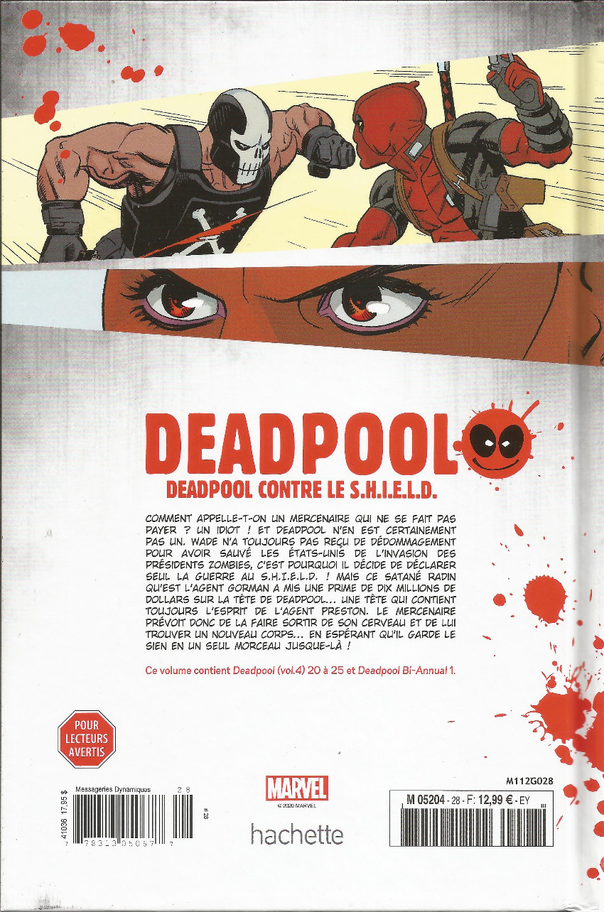 Comment appelle-t-on un mercenaire qui ne se fait pas payer ? Un idiot ! Et Deadpool n’en est certainement pas un . Wade n’a toujours pas reçu de dédommagement pour avoir sauvé les Etats-Unis de l’invasion des présidents zombies, c’est pourquoi il décide de déclarer seul la guerre au S.H.I.E.L.D. ! Mais ce satané radin qu’est l’agent Gorman a mis une prime de dix millions de dollars sur la tête de Deadpool… Une tête qui contient toujours l’esprit de l’agent Preston. Le mercenaire prévoit donc de la faire sortir de son cerveau et de lui trouver un nouveau corps… En espérant qu’il garde le sien en un seul morceau jusque-là !