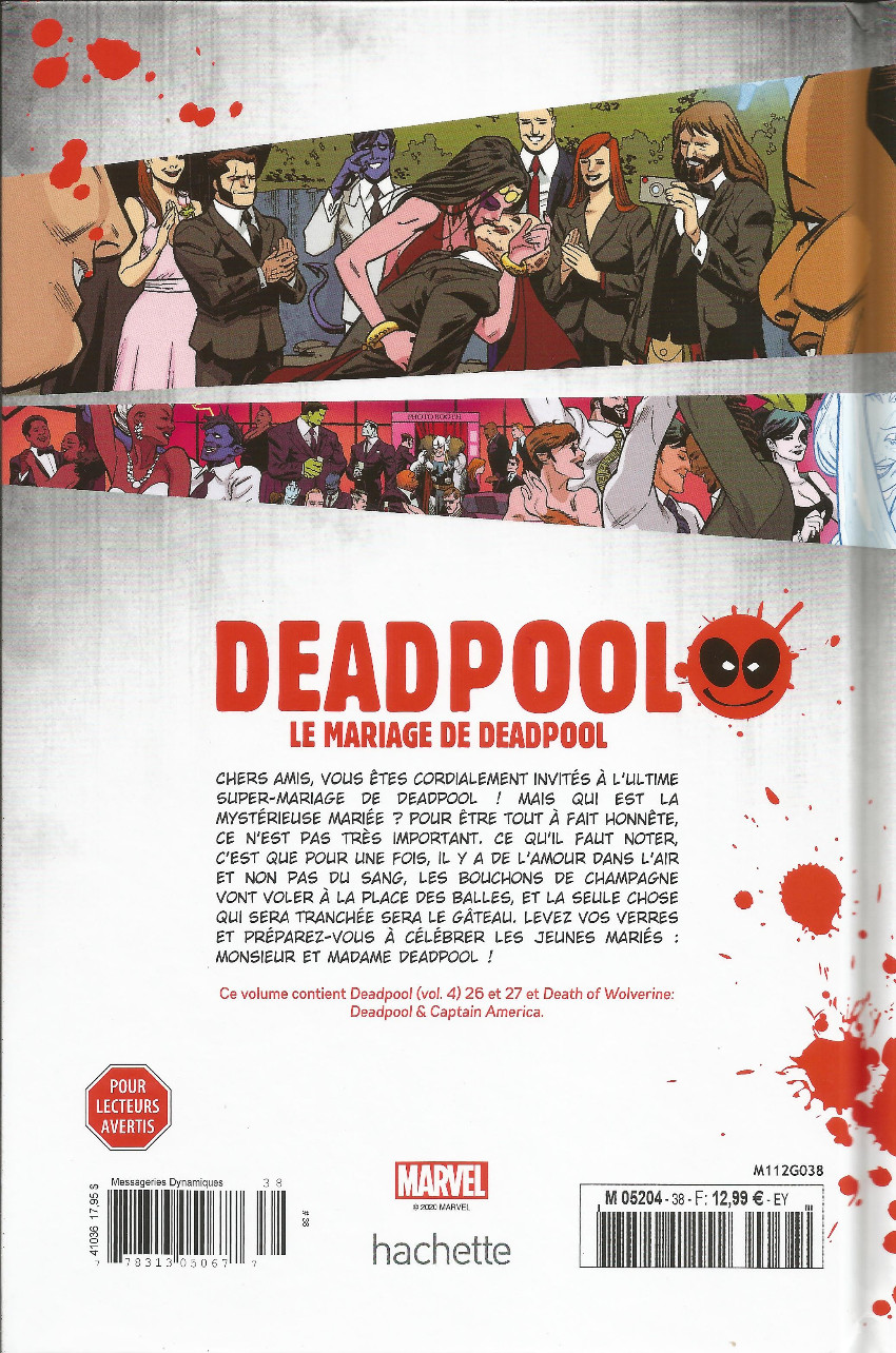 Chers amis, vous êtes cordialement invités à l’ultime super-mariage de Deadpool ! Mais qui est la mystérieuse mariée ? Pour être tout à fait honnête, ce n’est pas très important. Ce qu’il faut noter, c’est que pour une fois, il y a de l’amour dans l’air et non du sang, les bouchons de champagne vont voler à la place des balles, et la seule chose qui sera tranchée sera le gâteau. Levez vos verres et préparez-vous à célébrer les jeunes mariés: Monsieur et Madame Deadpool !