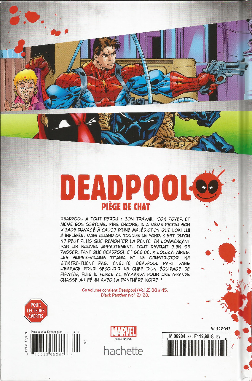 Deadpool a tout perdu: son travail, son foyer et même son costume, pire encore, il a même perdu son visage ravagé à cause d’une malédiction que Loki luia infligée. Mais quand on touche le fond, c’est qu’on ne peut plus que remonter la pente, en commençant par un nouvel appartement.Tout devrait bien se passer, tant que Deadpool et ses deux colocataires, les super-vilains Titania et le Constrictor, ne s’entre-tuent pas. Ensuite, Deadpool part dans l’espace pour secourir le chef d’un équipage de pirates, puis il fonce au Wakanda pour une grande chasse au félin avec la Panthère Noire !