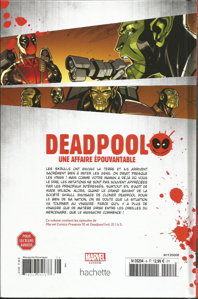 Les Skrulls ont envahi la terre et ils arrivent sacrément bien à imiter les gens. On dirait presque les vrais ! Mais comme votre maman a déjà dû vous le dire, les imitations ne sont pas souvent appréciées par les principaux intéressés. Surtout s’il s’agit de Wade Wilson. Alors, quand le grand savant de la société Skrull envisage de cloner Deadpool pour le bien de sa nation, on se doute que la situation va tourner au vinaigre. Parce qu’il y a plus de vinaigre que de matière grise entre les oreilles du mercenaire. Que le massacre commence !