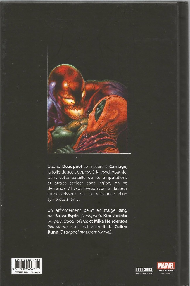 Quand Deadpool se mesure à Carnage la folie douce s’oppose à la psychopathie. Dans cette bataille où les amputations et autres sévices sont légion, on se demande s’il vaut mieux avoir un facteur autoguérisseur ou la résistance d’un symbiote alien… Un affrontement peint en rouge sang par Salva Espín (Deadpool), Kim Jacinto (Angela: Queen of Hel) et Mike Henderson (Illuminati), sous l’oeil attentif de Cullen Bunn (Deadpool Massacre Marvel).