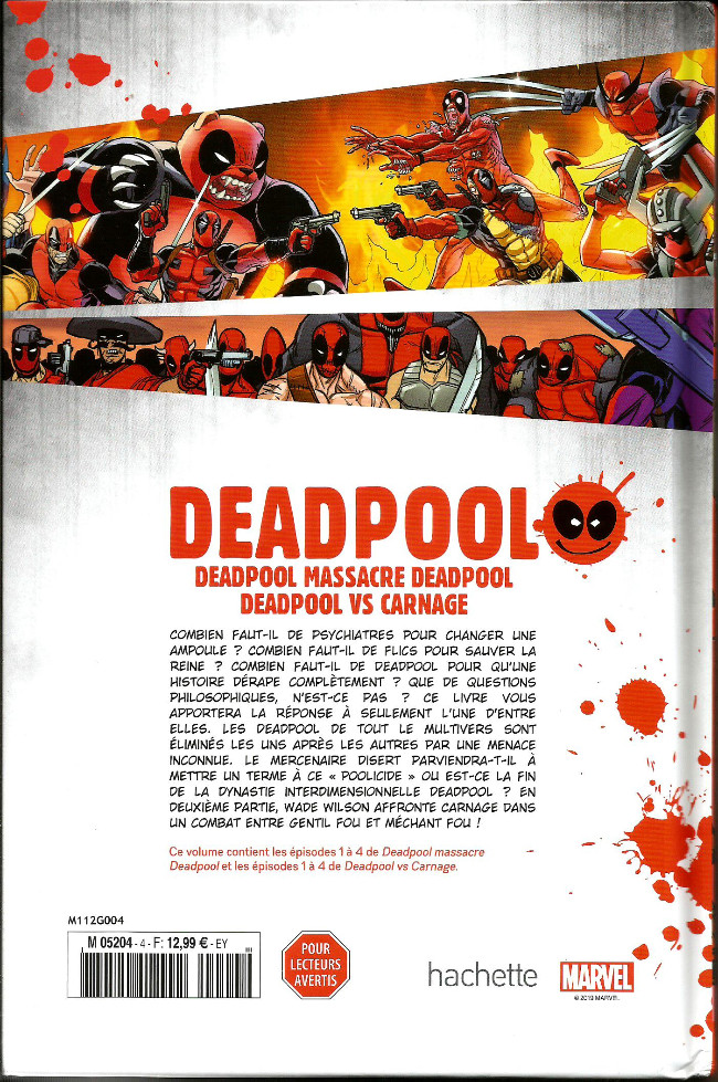 Combien faut-il de psychiatres pour changer une ampoule ? Combien faut-il de deadpool pour qu’une histoire dérape complètement ? Que de questions philosophiques, n’est-ce pas ? Ce livre vous apportera la réponse à seulement l’une d’entre elles. Les Deadpool de tout le multivers sont éliminés les uns après les autres par une menace inconnue. Le mercenaire disert parviendra-t-il à mettre un terme à ce “poolicide” ou est-ce la fin de la dynastie interdimensionnelle Deadpool ? En deuxième partie, Wade Wilson Affronte Carnage dans un combat entre gentil fou et méchant fou !